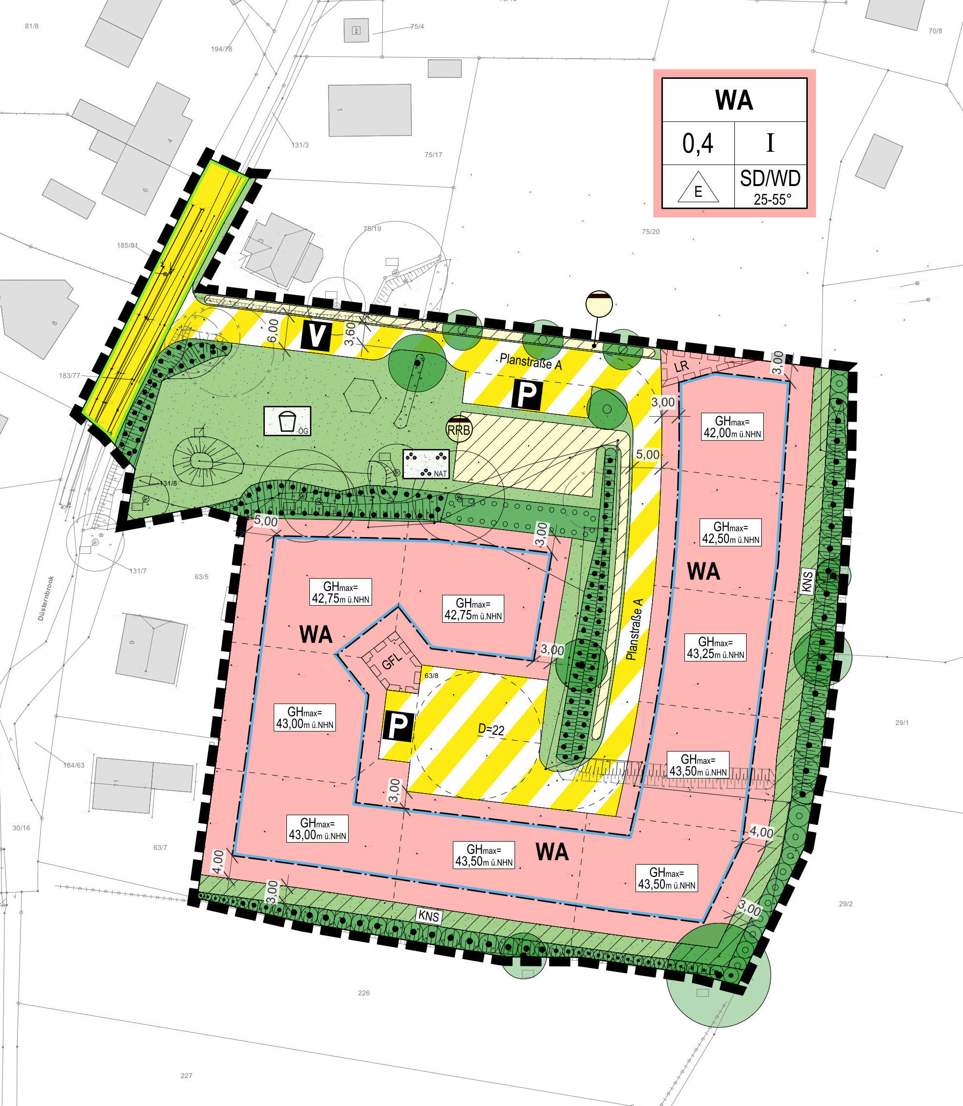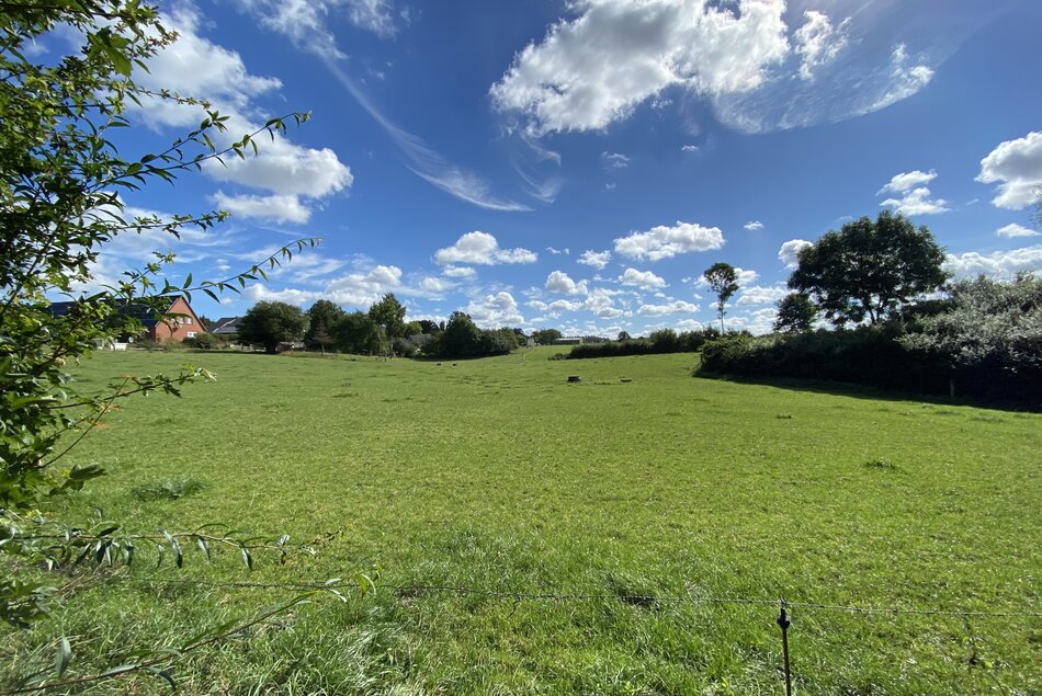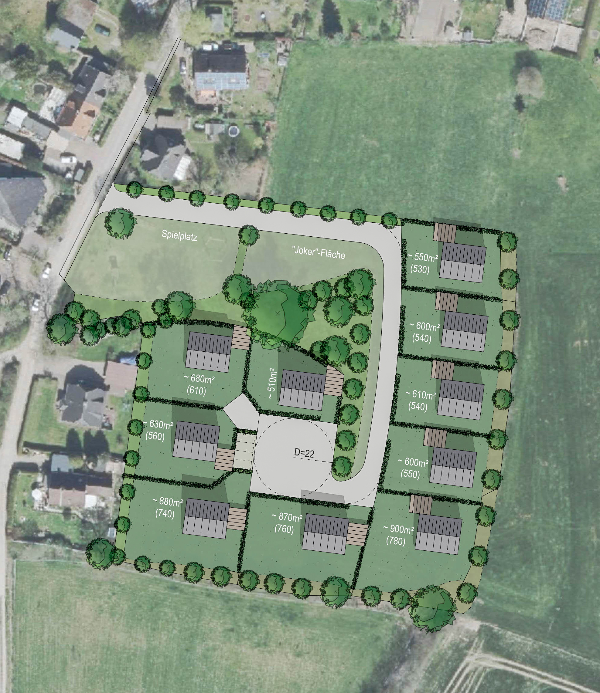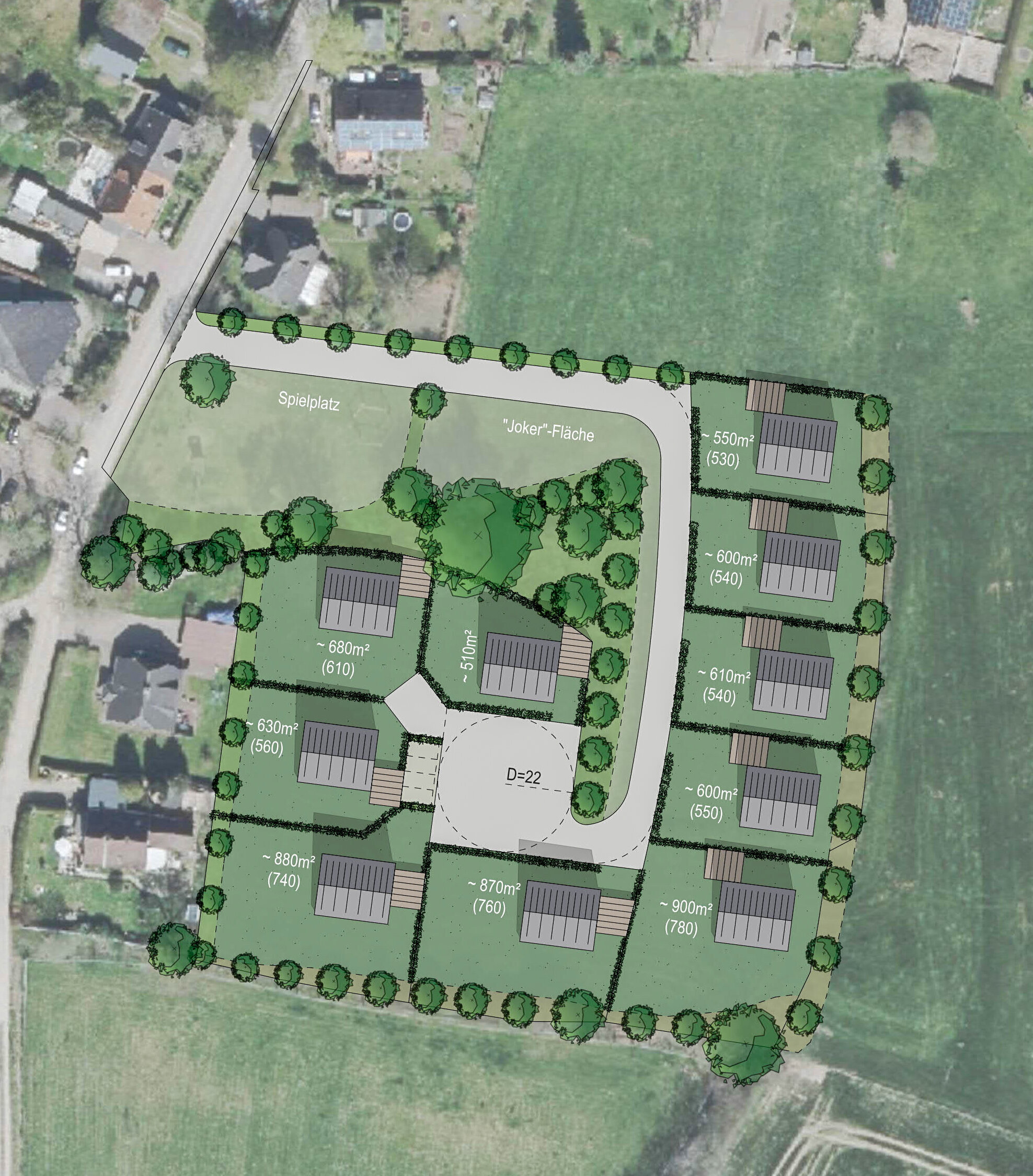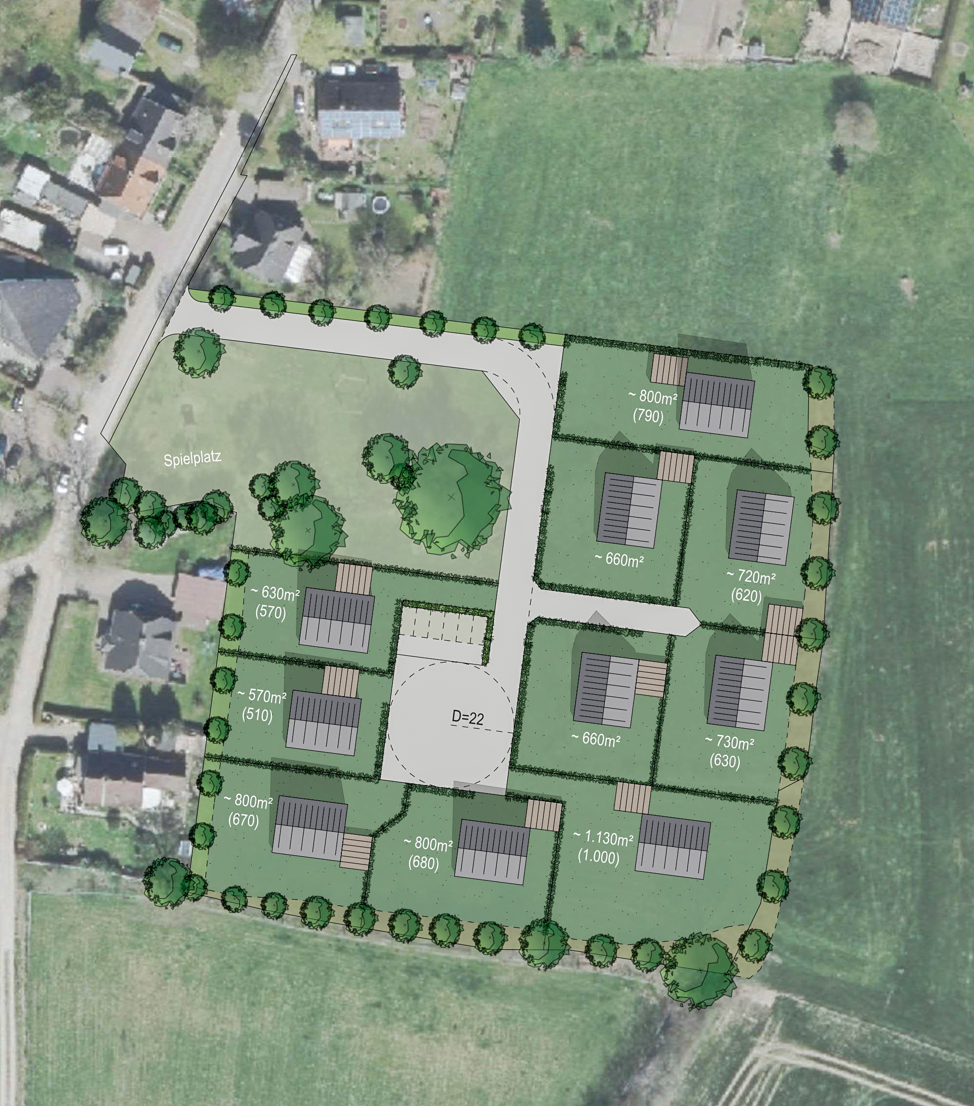 Auf der gemeindeeigenen Fläche wurde unter Berücksichtigung des orts- und landschaftsbildprägenden Grün- und Knickbestandes eine moderate und ortsangemessene Entwicklung mit insgesamt zehn Einfamilienhausgrundstücken geplant, die ein kleinräumliches und homogenes Wohnquartier mit hoher Freiraum- und Lebensqualität in exponierter Lage ermöglicht. Ende 2024 konnte das notwendige Baurecht über den Bebauungsplan Nr. 6 gemeinsam mit B2K - und allen Widrigkeiten zum Trotz - erfolgreich abgeschlossen werden, sodass die Gemeinde 2025 in die Vorbereitungen für die Umsetzung gestartet ist.
